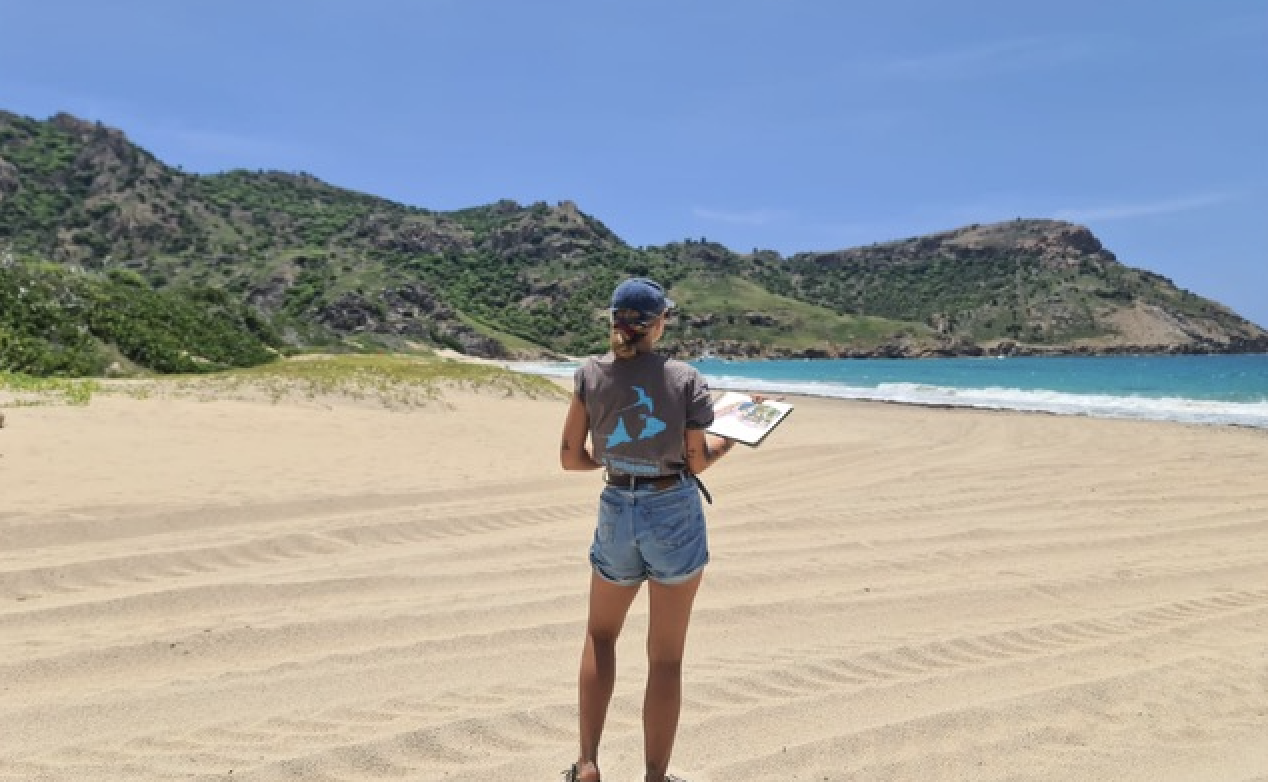 À Grand-Fond, nous combinons les prises de vue par drone (2–3 fois/an) de la végétation globale de la plage et le suivi bimestriel d’individus de Tournefortia gnaphalodes (appelé Romarin blanc bord-de-mer). L’objectif : visualiser l’évolution du tapis végétal face aux aléas météo, à l’urbanisation et à la pression de la chenille d’Utetheisa pulchella sur les Tournefortia g. Cette double approche, à la fois panoramique et au plus près des plantes, permet d’évaluer des mesures de conservation littorale à mettre en place.